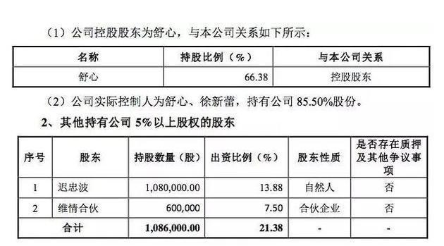 维情股份的《公开转让说明书》显示,维情公司成立于2009年,股份公司成立于2016年,目前注册资本为800万元。维情股份主要从事婚姻家庭咨询与服务的业务,法定代表人是舒心。公司的实际控制人为合计持股85.50%的舒心、徐新蕾夫妻二人,均为“60后”。舒心曾在上海宜川街道社区服务中心工作8年半之久,徐新蕾则毕业于心理咨询与治疗培训中心(海南)。