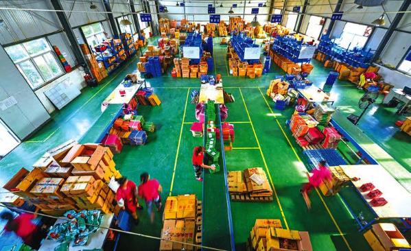 哎哟喂电子商务有限公司物流车间内,工人们正在包装、分拣发往全国各地的快递包裹。