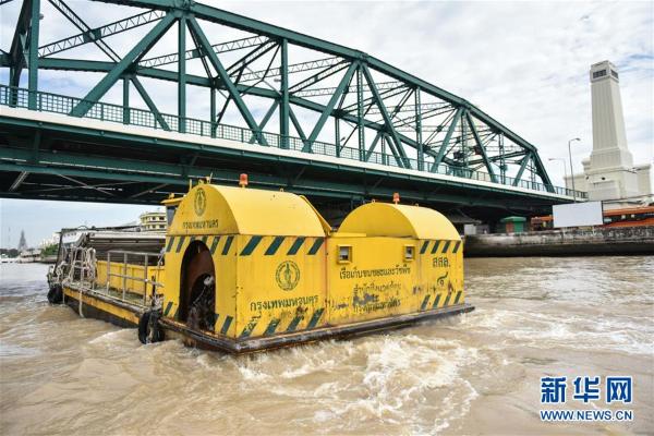 6月12日,在泰国曼谷,一艘清理打捞作业船在湄南河作业。为疏通水上航道、改善城市排水效率,曼谷市政府近日组织清理市区主要河流——湄南河上的水葫芦等水面飘浮物,预计清理工作将持续至6月下旬。新华社记者 李芒茫 摄