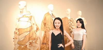 图为毕业生与自己的服装设计作品合影。