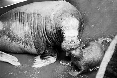 6月13日凌晨0时59分,沈阳皇家海洋乐园的海象格鲁沙成功晋升为妈妈,顺利产下了雌性海象宝宝。小海象体长1.2米,体重53千克,体表有稀疏的黄褐色短毛。据悉,经省海洋与渔业厅、全国野生水生动物保护协会、农业部渔业局等相关部门核实确认,这是全国首例人工养育海象产仔。