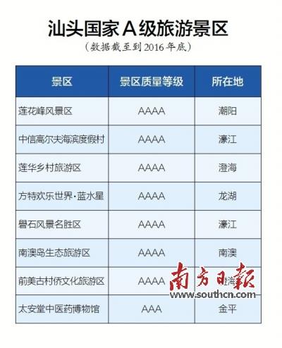 数据显示,截至2016年底,汕头国家A旅游景区共有8处,较2015年增多1处,其中AAAA级旅游景区7处,AAA级旅游景区1处。
