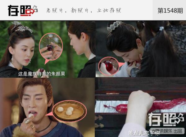 【鹿晗戏中吃解药差点被噎 樱桃鱼丸香肠全成了道具】《择天记》吸引了不少粉丝观看,但剧中道具有不少槽点。剧中,鹿晗扮演的陈长生昏迷,被喂了一颗超大解药(图右上),原本应该无意识的他,居然自动张嘴吞下了这颗药,似乎差点被噎。其实,这还是种高科技的道具,外皮用海藻做的,注水后能直接服用。另一集里,娜扎给鹿晗吃一颗“魔族特有”的水果(图左上),从树上摘下时,疑似是用细绳新系上去的,而且这水果怎么看都是樱桃啊!另外,还有神似鱼丸的仙丹(图左下)、神似香肠的千年人参(图右下),这个剧组的道具师一定是个吃货!