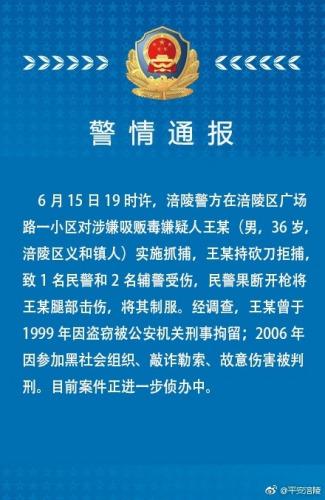 中新网6月16日电 据重庆市公安局涪陵区分局官方微博“平安涪陵”消息,15日晚7时许,涪陵警方在重庆市涪陵区广场路一小区对涉嫌吸贩毒嫌疑人王某实施抓捕时,王某持砍刀拒捕,致1名民警和2名辅警受伤,民警果断开枪将王某腿部击伤,将其制服。