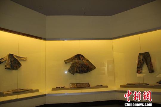 图为新疆兵团军垦博物馆内展出的国家一级革命文物——三件补丁摞补丁的衣服,位于中间的那件军大衣有296块补丁,已看不出原本的模样。 袁晶 摄