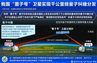 这篇题为《基于卫星的纠缠分发距离超过1200公里》的论文说,通过“墨子号”向地面发射光子,每对处于纠缠状态的光子中的一个发向青海德令哈站,另一个发向云南丽江站,两个地面站之间的距离达到1203公里。这是世界上首次实现千公里量级的量子纠缠,以往国际学界的量子纠缠分发实验只停留在百公里的距离。