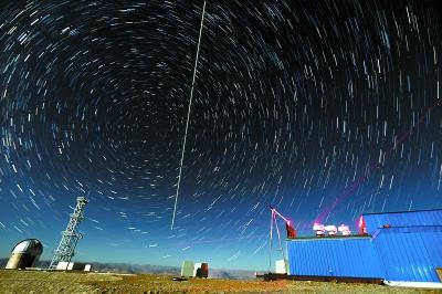 2016年12月10日,在西藏阿里观测站,“墨子号”量子科学实验卫星过境,科研人员在做实验(合成照片)。