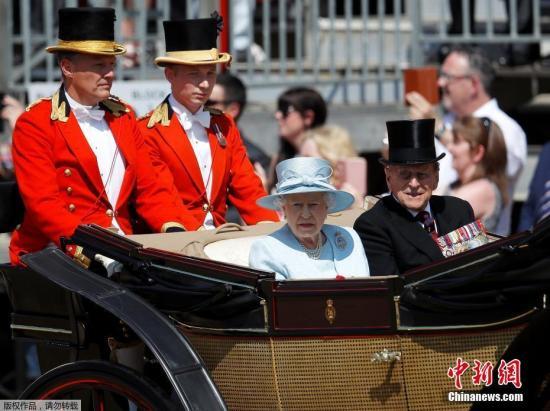 当地时间6月17日,英国伦敦举行盛大皇家阅兵仪式,庆祝英女王伊丽莎白二世91岁的官方生日。图为英国女王夫妇观看阅兵式。