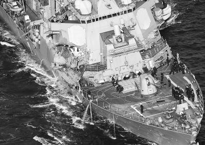 现场照片显示,“菲茨杰拉德”号驱逐舰右侧大幅受损,船体部分进水,不过并无沉没风险。美国国防部一名官员接受法新社记者采访时透露,船员们正在进水区域排水。