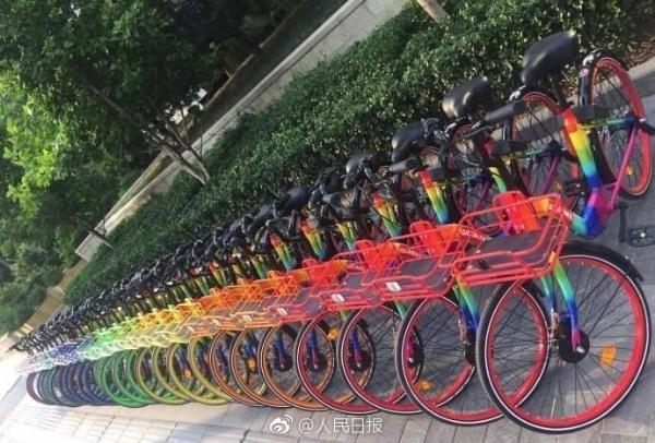 2017年6月19日,北京街头近日出现了一款七彩共享单车,在望京及三里屯商区都有投放。图片来源网络。