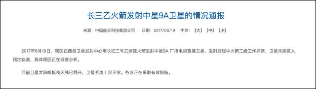航天火箭发射失误。《环球时报》微信公众号报道,据中国航天科技集团公司官方网站消息,2017年6月19日,我国在西昌卫星发射中心用长征三号乙运载火箭发射中星9A 广播电视直播卫星,发射过程中火箭三级工作异常,卫星未能进入预定轨道,具体原因正在调查分析。