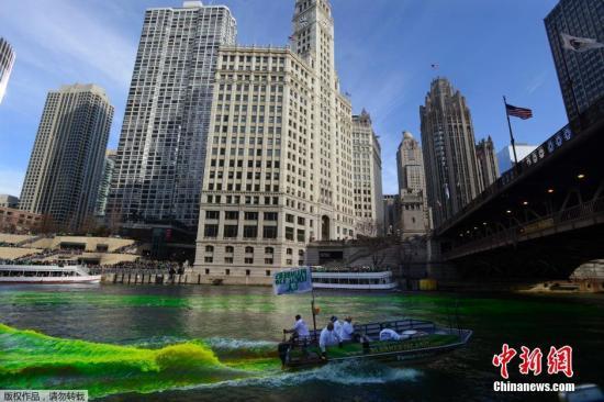 资料图为流经芝加哥市中心的芝加哥河被“染成”绿色,以庆祝圣帕特里克节。