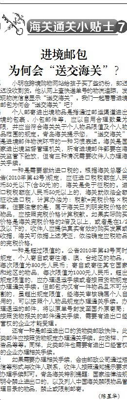如果需要办理相关手续,会由邮政公司通过短信等形式与收件人联系,收件人按照通知提示要求办理手续即可。青岛海关特别提醒:国家法律法规明令禁止进出口的,以及列入中国海关禁限物品管理目录的物品,禁止或限制邮寄。