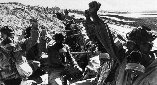 1987年1月,在伊拉克巴士拉附近,伊朗士兵戴着防毒面具以防备毒气攻击。