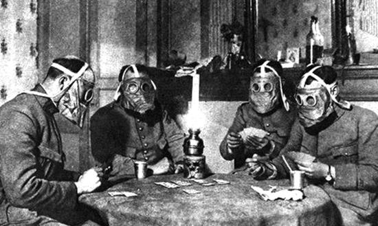 1917年,法国前线,几名士兵戴着防毒面具打牌。