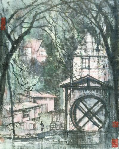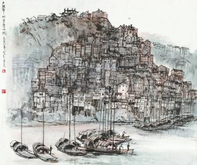 在写生过程中,他并不是采用西方的写生方式,也不是简单地拿传统的程式化语言去套用自然,而是站在东方文化的立场上,采用开放的态度去感知自然,同时大胆发现新的审美领域,把山水画从古人的视角移向具有当代感的视角上,从中寻找山水画笔墨表现的新可能,又审慎地吸纳西方的视觉经验并为我所用。在写生过程中,他大胆涉及水墨山水表现多方面的新领域,描绘了大量不同地域特征的中外城市,《鲁迅故乡绍兴城》、《夕照中的重庆山城》、《万县》、《略阳城》、《德国麦森教堂》、《德累斯顿暮色》……这些特殊意境的表现,无疑给艺术家提出了重新建构笔墨造型方式的新挑战:如何表现不同风格的建筑、树木、环境的特殊意境?怎样将复杂的环境归纳、统一起来,使其秩序化、笔墨化,既要突出特征又能含蓄概括?这不仅需要智慧,而且需要反复实践、研究其特殊的造型规律。