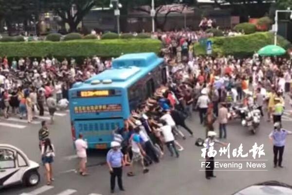 福州新闻网6月26日讯(福州晚报记者王光慧)昨日18时左右,在福清闹市区街心公园拐角处,一辆行驶中的823路公交车在转弯时不慎将一名骑车的老人卷入车底。危急时刻,周边数十名市民抬车救人。最后在市民、消防官兵、民警的努力下,老人被顺利救出。