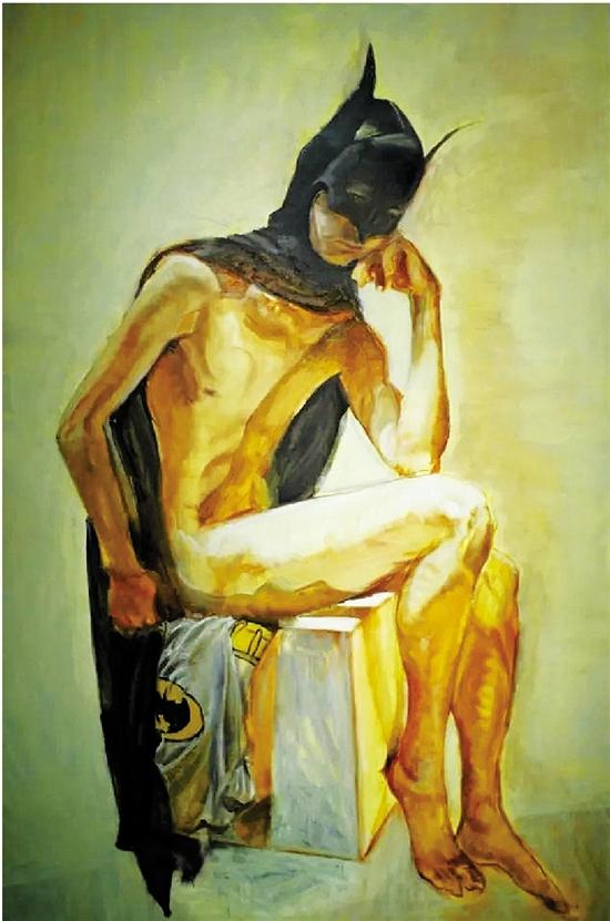 这位艺术家虽然才20岁出头,创作思路却很宽广。他的画作中散发着同龄人鲜有的锋芒和锐意。他从古代神话和超级英雄里寻找众神。他的作品里,蝙蝠侠摆了个思想者的造型,光着膀子坐在石膏凳上,翟莫梵用大幅油画描绘的“当代诸神系列”,在一个现代的展览空间里产生了有趣的矛盾冲突。