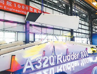 6月27日,哈尔滨哈飞空客复合材料制造中心在哈尔滨交付第1000架份复合材料A320方向舵。方向舵是客机的重要零部件,空中客车中国公司表示,哈飞空客复合材料制造中心是A320系列飞机方向舵的全球唯一供应商。图为吊在空中的第1000架份A320方向舵。