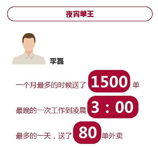 “杭州的外卖单子太多了,只要你肯出力,就不怕没活干”,李磊说,他从今年过完年回来,就没有休息过,最晚的一次工作到凌晨3点,最多的一天,送了80单外卖,最多一个月赚了1.2万元。
