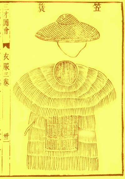 明清时,雨季出行人们大多都带蓑衣。明徐光启《农政全书》中记载了当时一条流行谚语:“上风皇,下风隘,无蓑衣,莫出外。”