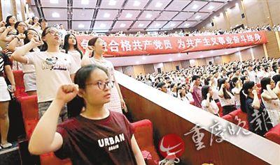 重庆晚报讯 (记者 周小平 毕克勤 摄影报道)今天是中国共产党96周岁生日,昨日,重庆大学分别在虎溪校区和老校区举行预备党员入党宣誓和部分老党员重温入党誓词活动,32个学院、3个机关党支部的学生预备党员、老党员代表参加宣誓活动。虎溪校区参与宣誓学生党员为545名,老校区参与宣誓学生党员有794名。
