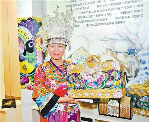 在另一边的酉州苗绣展示区,一组加入了西南卡普元素的手包成为了众人关注焦点。“传统的西南卡普使用的线比较粗,而我们采用了更加细的线,制作出来的西南卡普图案也更加精致。”展区负责人告诉记者,除手包外,在此次交流对接会上,他们还带来了百岁枕、水晶鞋等十多种苗绣或西南卡普工艺品进行展销。
