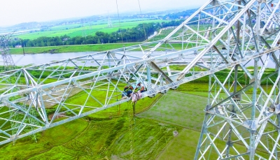 2017年6月21日,技术人员在昌吉—古泉特高压输电工程安徽铜陵境内的铁塔上进行设备安装作业。陈晨摄 光明图片/视觉中国