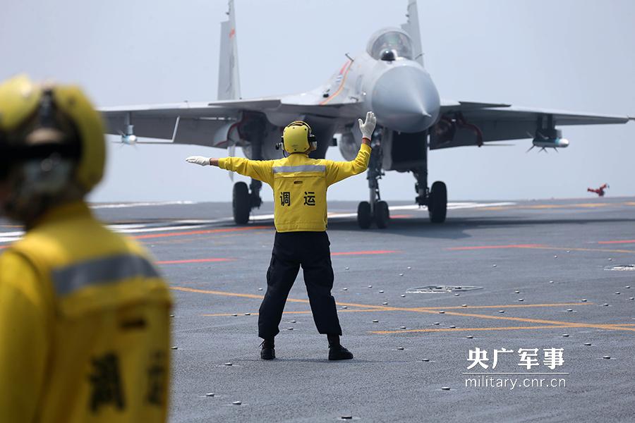 引导员在辽宁舰飞行甲板指挥转运歼-15舰载战斗机。李唐摄