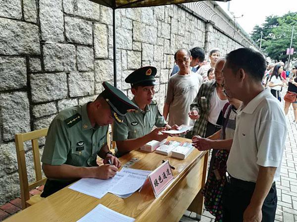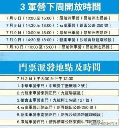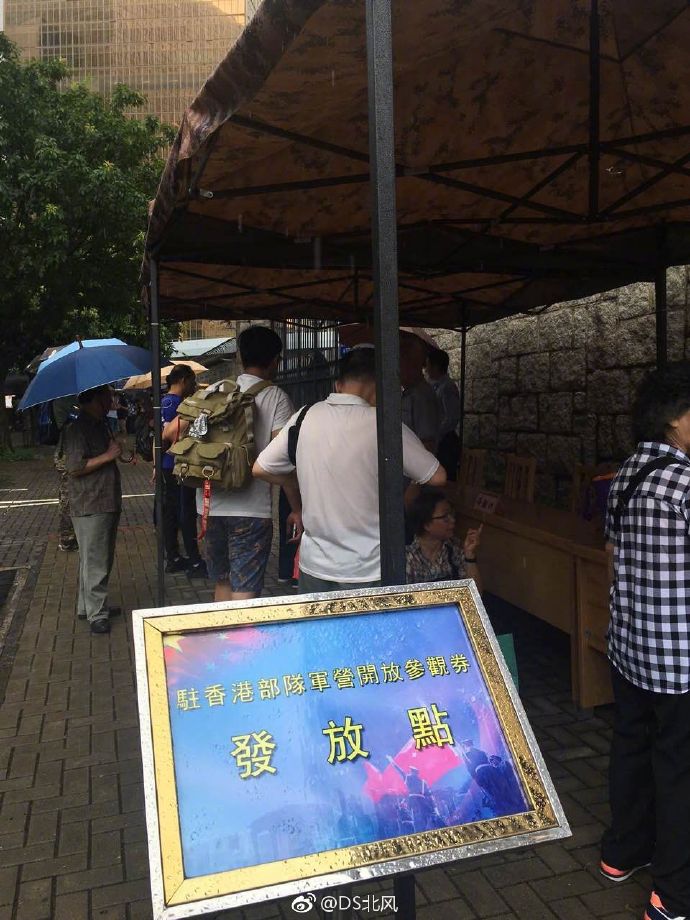 这次驻港部队开放昂船洲、石岗、新围三个军营,共派发36000张门票。2日早晨8时,中环军营前轮候的市民已绕军营一圈,在北门较宽阔处,蛇形队伍转了三四层。排前面的数十名市民,全是提前一天就到军营排队,最早的1日晚上8点已经到达。驻港部队在军营东门领票处北侧,为70岁以上老人和伤残人士专门另开一条优待领票点。