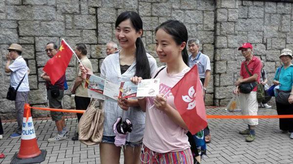 据香港文汇报7月3日报道,2日,近万香港市民在驻港部队6个派票点排队等候,希望能入军营一睹国家强大军备,不少市民更在中环军营通宵守候,虽然彻夜无眠、个个“熊猫眼”,但拿到参观门票的那一刻,无不欢喜雀跃。驻港部队表示,至2日中午12时许,6个派发点的所有门票均全数派清。