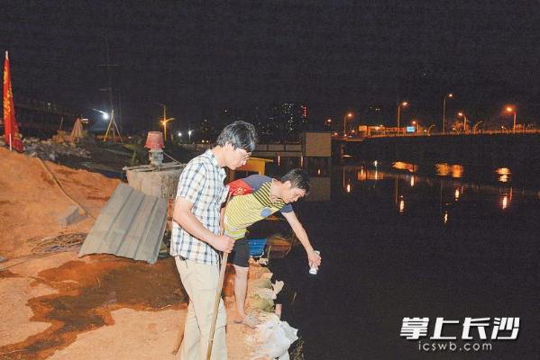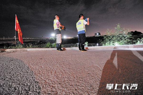 昨晚11时许,滨洲新村港子河南岸,志愿者在巡查。 长沙晚报记者 王志伟 摄