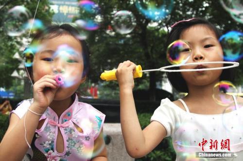 资料图:两位小朋友正在玩耍。中新社发 刘占昆 摄