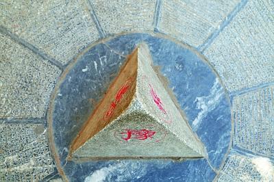 透过三省碑下的缝隙,笔者看到碑下有一块露出地面的三棱尖石。尖石一面朝西,一面朝东南,一面朝东北。三省以此石为界,西北归陕西管,属陕西白浪镇;东北归河南管,属河南荆紫关镇白浪村;南归湖北管,属湖北白浪镇。此石也就被称为“三省石”,也称“一脚踏三省”石。游人踩在上面,可以体验“脚踏三省、气吞九州”的豪迈。