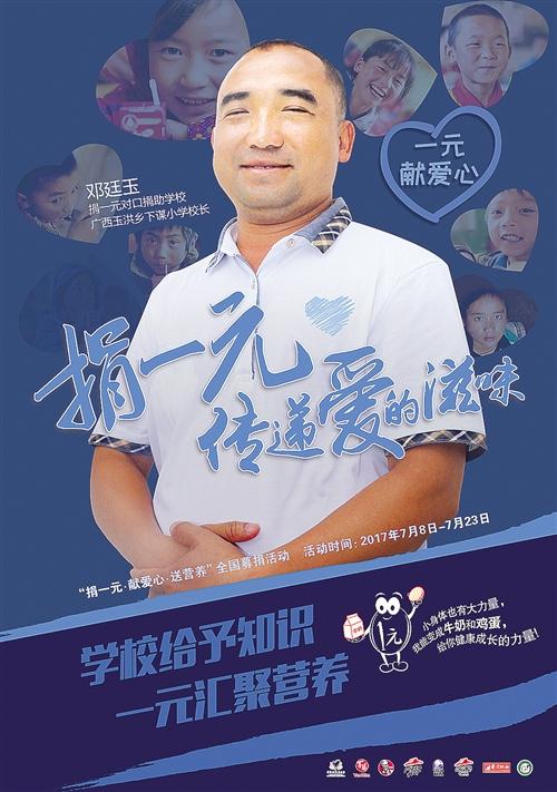 今年,邓廷玉校长成了百胜中国“捐一元”项目的其中一位代言人,他希望通过下谋村中心小学的学生营养得到改善的事例来告诉大家,“捐一元”正在帮助更多的孩子获得健康成长。他更希望通过自己的力量号召更多人一起加入“捐一元”公益项目,让更多的孩子喝上牛奶、吃上鸡蛋,让孩子们吃上热腾腾的饭菜。