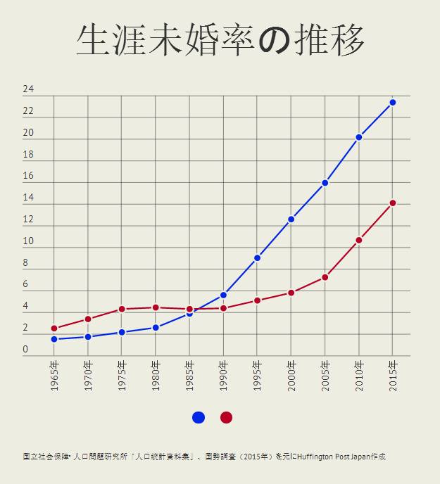 日本国立社会保障与人口问题研究所4月公布关于“终生未婚率”的调查,蓝点代表男性“终生未婚率”,红点代表女性“终生未婚率”。