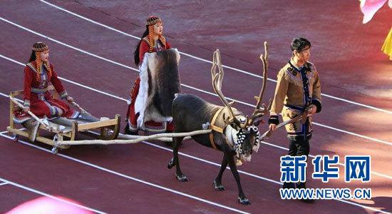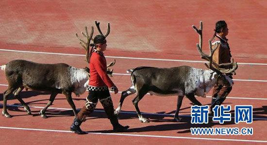 7月12日,呼伦贝尔,敖鲁古雅鄂温克人带驯鹿参加内蒙古自治区第九届少数民族传统体育运动会开幕式。任婷婷 摄