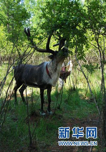 6月22日,敖鲁古雅使鹿部落景区,正在啃树叶的驯鹿。新华网 张敏彦 摄
