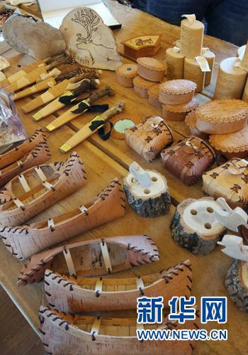 桦树船、皮包、驯鹿鹿角项链、耳环......各种手工艺品独具民族特色,上面的驯鹿形态优美,灵动活泼。