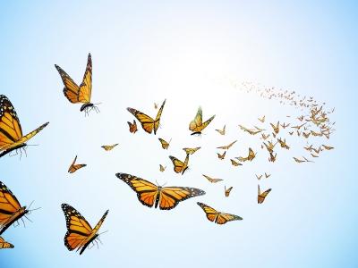 肉墩墩的毛虫究竟是怎样华丽变身成蝴蝶的呢?科学家发现,早在毛虫还在卵中发育时,它就长出了将会分化成蝴蝶眼睛、翅膀、腿等器官的多种细胞团,称“成虫盘”。毛虫成为蝶蛹后,开始分泌各种酶来消化溶解自己的全部组织,消化完成后的“成虫盘”迅速利用周围富含蛋白质的浆液来进行细胞分裂,分化出的细胞逐渐形成精致的翅膀、触角和腿,还有眼睛、生殖器及一只成年蝴蝶应具有的所有特征结构。从作茧自缚到破茧而出,一般要经过五至十天。