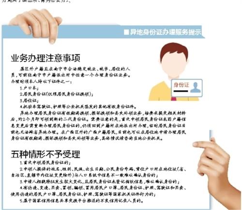 据了解,根据公安部和自治区公安厅的部署,南宁市逐步建立居民身份证异地受理、挂失申报和丢失招领制度(即“三项制度”),逐步开通权限,开展跨省异地受理试点工作。