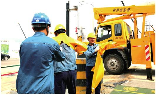 △国网泰安供电公司带电作业人员身穿绝缘服汗流浃背准备上杆作业