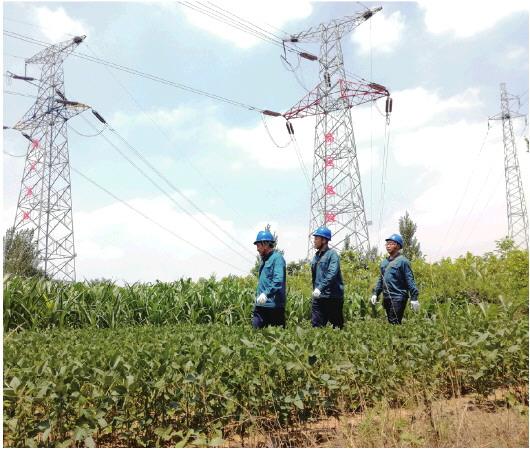 △国网泰安供电公司输电运检室工作人员穿越农田巡视供电线路