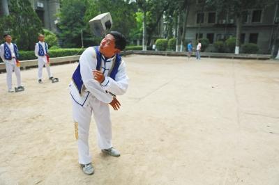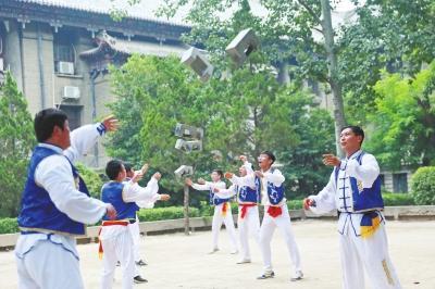 队员们正在练习对抛石锁,十几斤重的石锁在空中来回穿梭