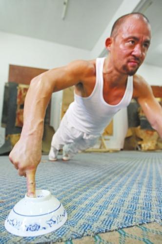 用手指做俯卧撑、倒立、碎碗可以说是这种功夫最好的呈现。现场,樊伟鹏一一为记者展示了这些绝技。记者触摸樊伟鹏的手指,他的十根指头要比常人粗壮许多,如钢条一样硬。目前,樊伟鹏还保持着60秒劈102个瓷碗的吉尼斯世界纪录。