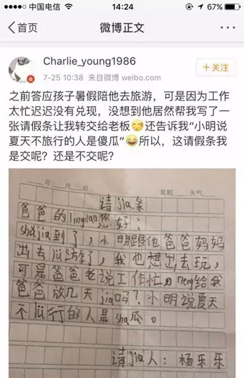 至于这次的请假条是否会真的上交给领导,杨先生说:“还没给,就算给的话其实也是当个孩子的小趣事跟领导说一下,不过经过这事我也下了决心这个暑假一定要请假带孩子出去走走。”