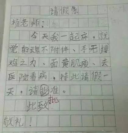 杨老师,今天我一起床,就觉得魂不附体、手无缚鸡之力、面黄肌瘦、去医院看病,特此请假一天,请批准!