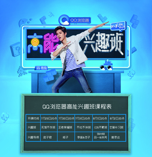 QQ浏览器高能兴趣班火热来袭!7月29日起,登录手机端QQ浏览器,通过顶端《高能兴趣班》推荐banner加入班级,每晚20:00都将有大咖直播授课,课程涵盖美食、游戏、吐槽、恋爱、COSPLAY等领域,连续5天不停歇,在第6天8月3日还将有意外惊喜。