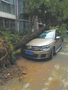 成都大风吹倒大树,砸中小区停放的车辆。图据新浪四川