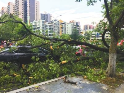 狂风吹断大树,砸中南充茂源南路口经过的车辆。